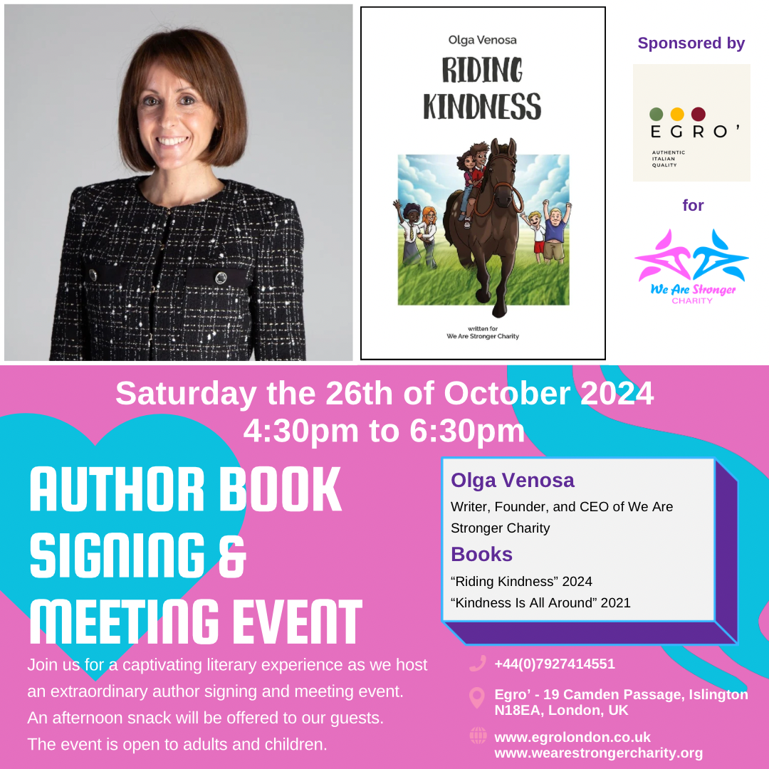 Adults and children are very welcome to meet the writer Olga Venosa, also Founder and CEO of We Are Stronger Charity, get a signed copy of her latest book “RIDING KINDNESS” and her first book “KINDNESS IS ALL AROUND” while enjoying a free afternoon snack offered by our lovely sponsor EGRO.